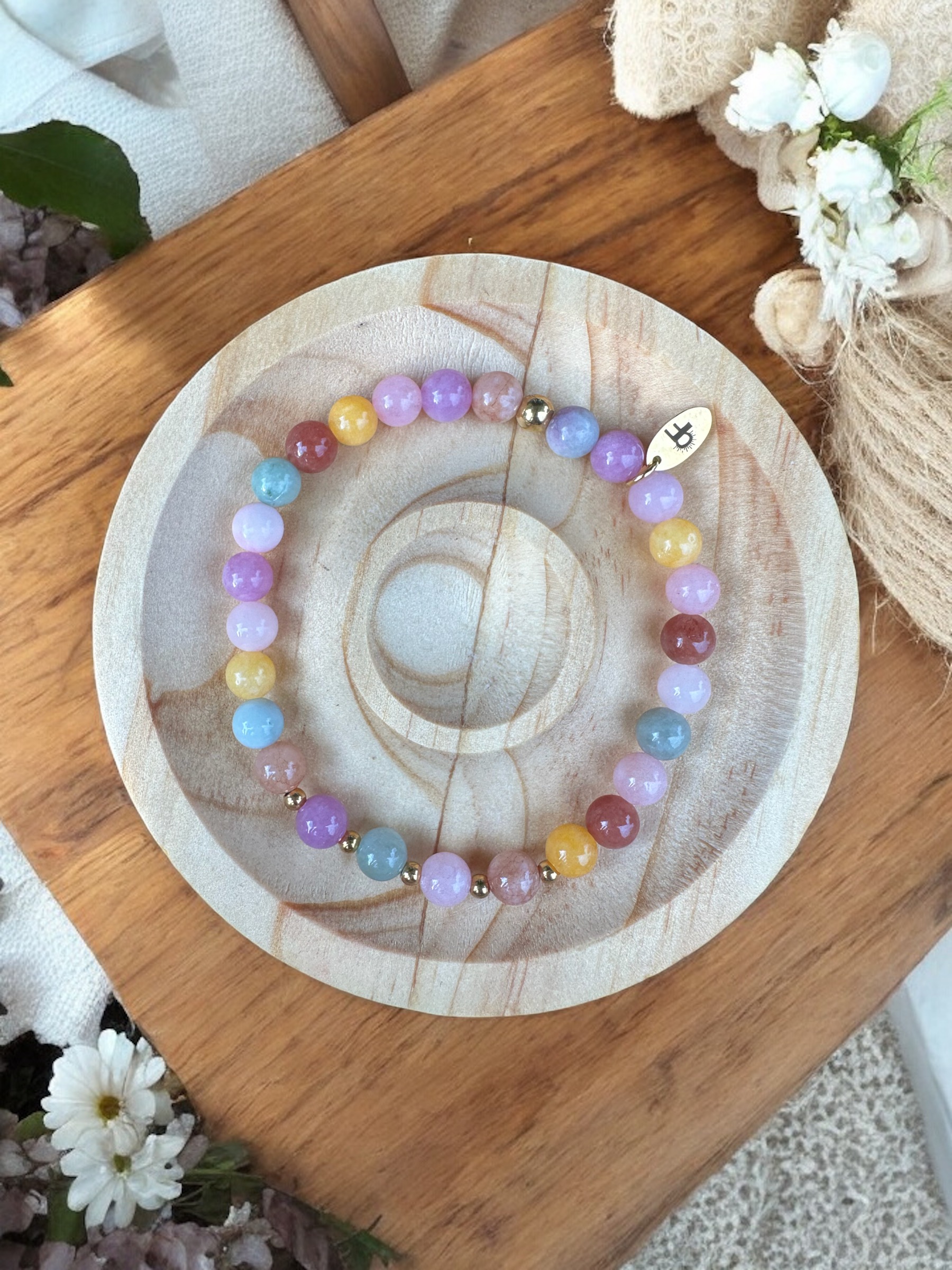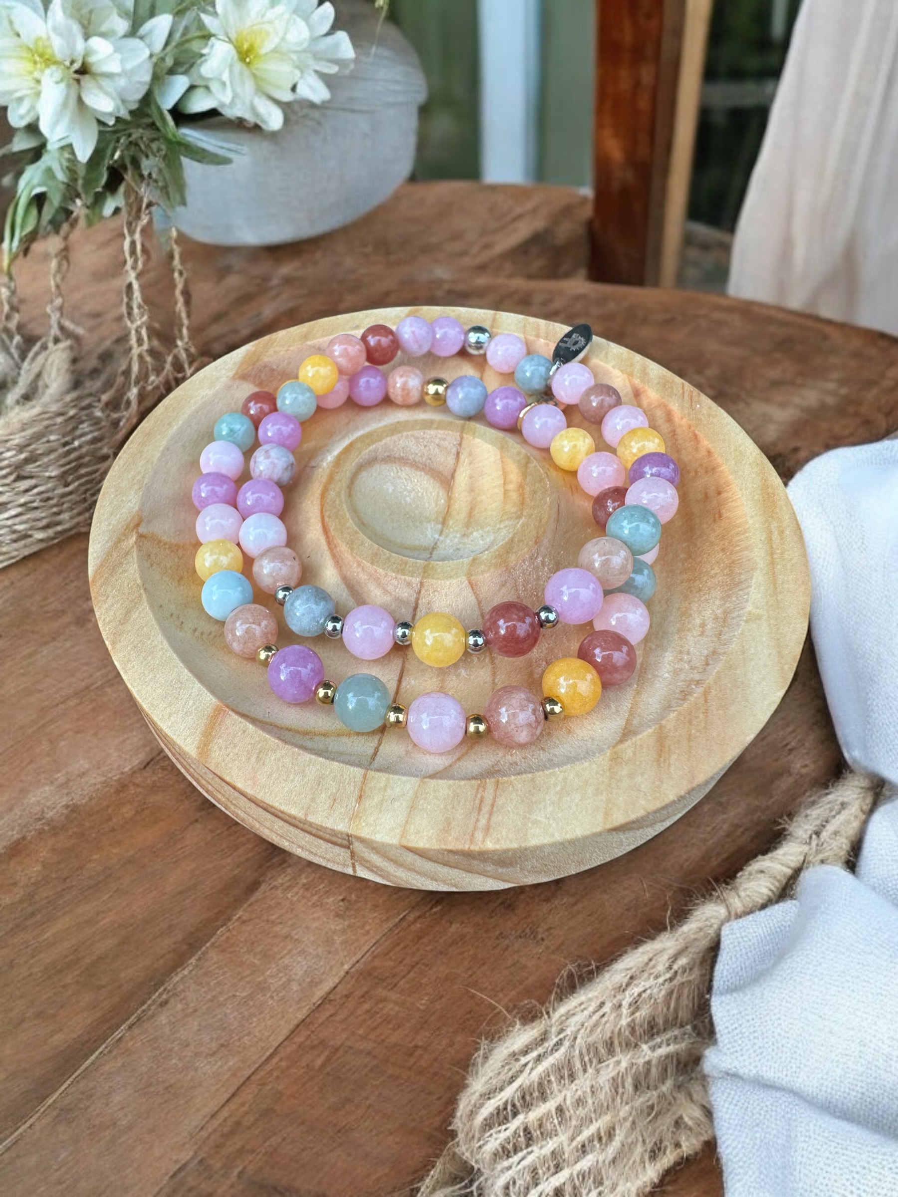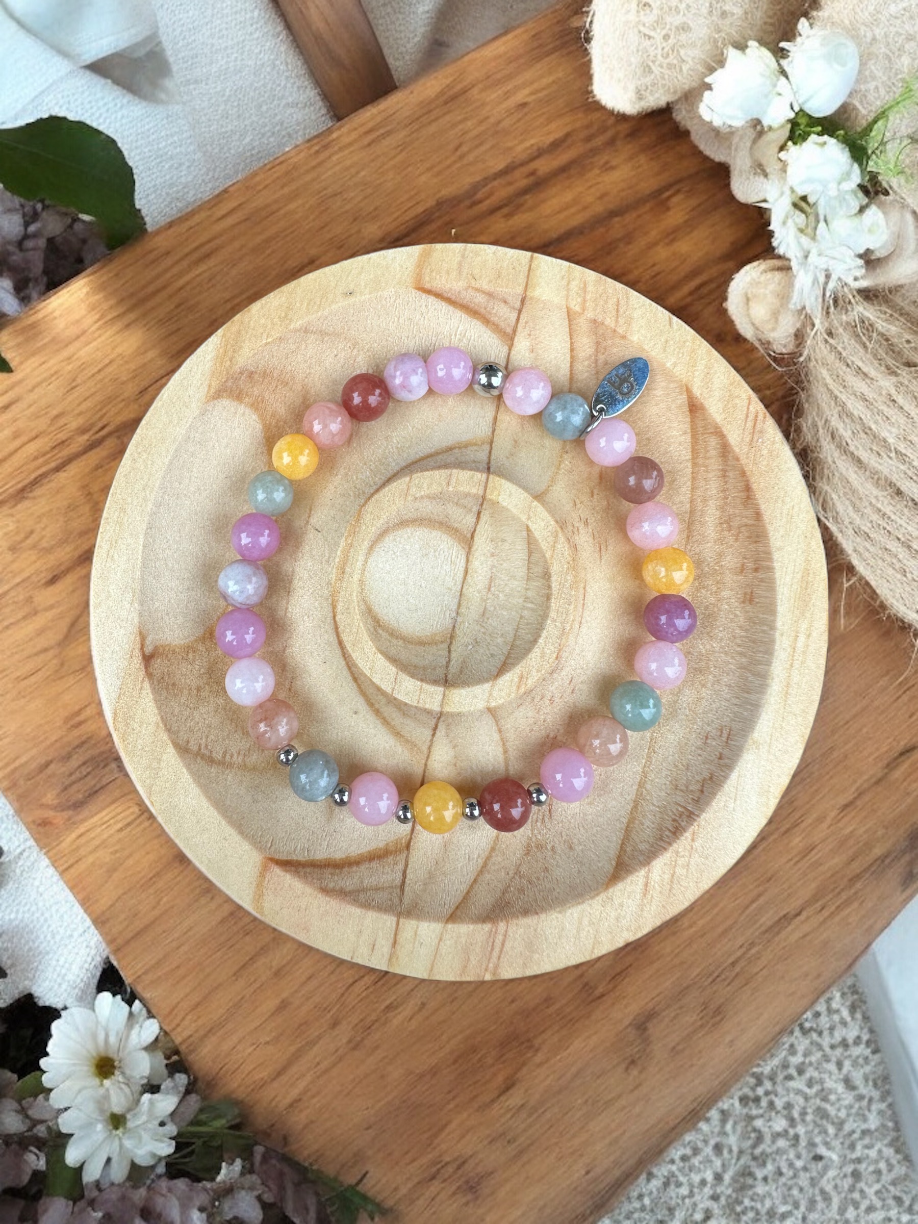 Die Kombination aus bunter Jade und Sonnenstein in diesem Armband fördert sowohl Lebensfreude als auch Vitalität in deinem Alltag. Sie hilft dir, eine positive Einstellung zu bewahren und die Energie des Glücks in dein Leben zu ziehen, während sie gleichzeitig das Gefühl von innerer Harmonie stärkt. Trage dieses Armband, um das Licht und die Freude in dir zu aktivieren und eine Atmosphäre des Optimismus und der Begeisterung zu schaffen. Es unterstützt dich dabei, die schönen Momente im Leben zu feiern und eine positive Ausstrahlung zu entwickeln, die auch andere inspiriert.